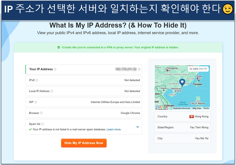 IP 검사 도구를 활용해 중국 IP 주소를 검사하자. 선택한 서버 위치에 따라, IP 주소에 홍콩, 마카오, 중국이 표시되어야 한다. 실제 위치 및/또는 IP 주소가 보인다면, 브라우저 캐시와 쿠키를 모두 삭제하고 VPN 서버에 연결하도록 하자.