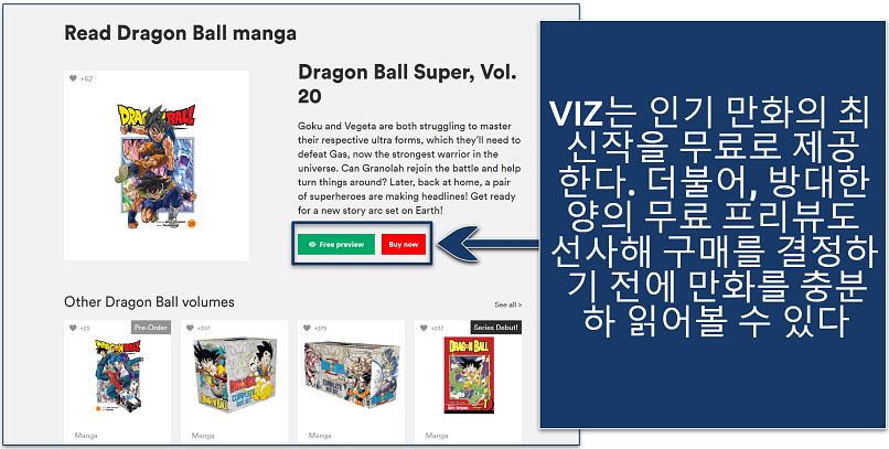 VIZ는 나의 히어로 아카데미아, 드래곤볼 슈퍼, 원피스 등과 같이 현재 연재 중인 시리즈의 최신 챕터를 일본 출간 후 거의 즉시 무료로 제공한다. 이러한 무료 챕터는 약 일주일 정도로 한정된 기간 동안만 이용 가능하며, 이후에는 아카이브 처리되어 유료 구독을 통해서만 감상할 수 있다. 따라서 최신 출간작을 그때그때 무료로 확인하길 바라는 독자들에게 이상적이다.