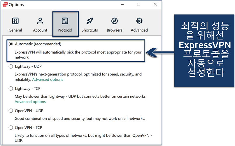 보안 프로토콜을 자동으로 설정하면 ExpressVPN에서 사용자 네트워크에 가장 알맞은 프로토콜을 자동 선택해 제공한다. 각 필요에 따라 설계된 프로토콜이 다양하게 준비되어 있다. 가령 OpenVPN처럼 조금 더 안전한 연결을 제공하는 프로토콜과 Lightway처럼 속도를 우선하는 프로토콜도 있다.